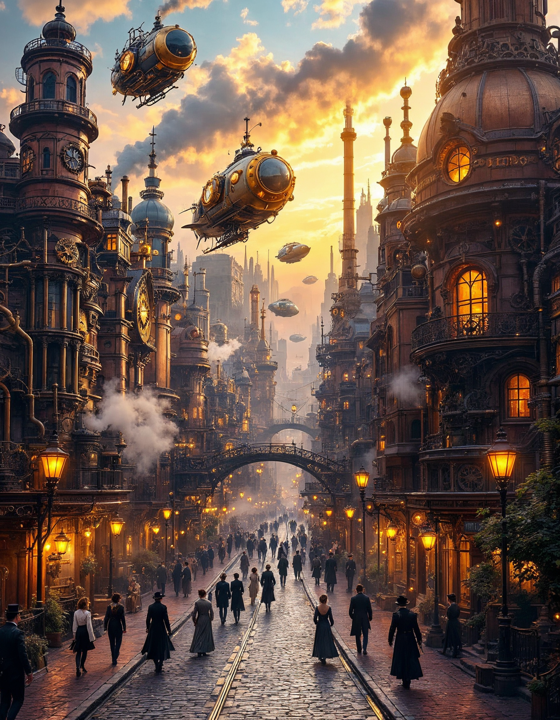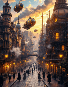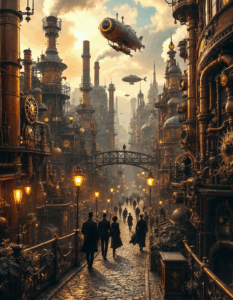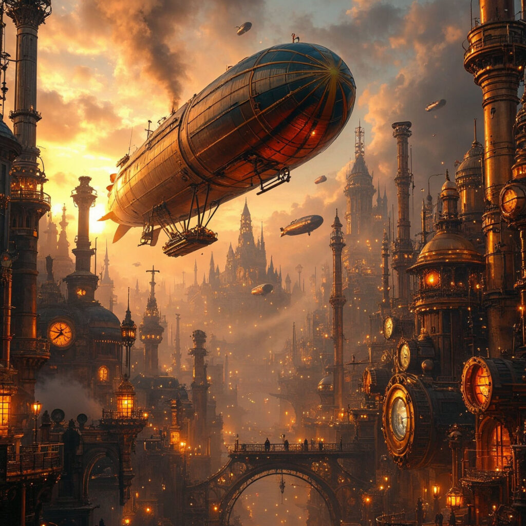 Mechanische Strukturen, Zahnräder, Luftschiffe und leuchtende Metalle erschaffen detailreiche Bildräume zwischen Vergangenheit und Vision.