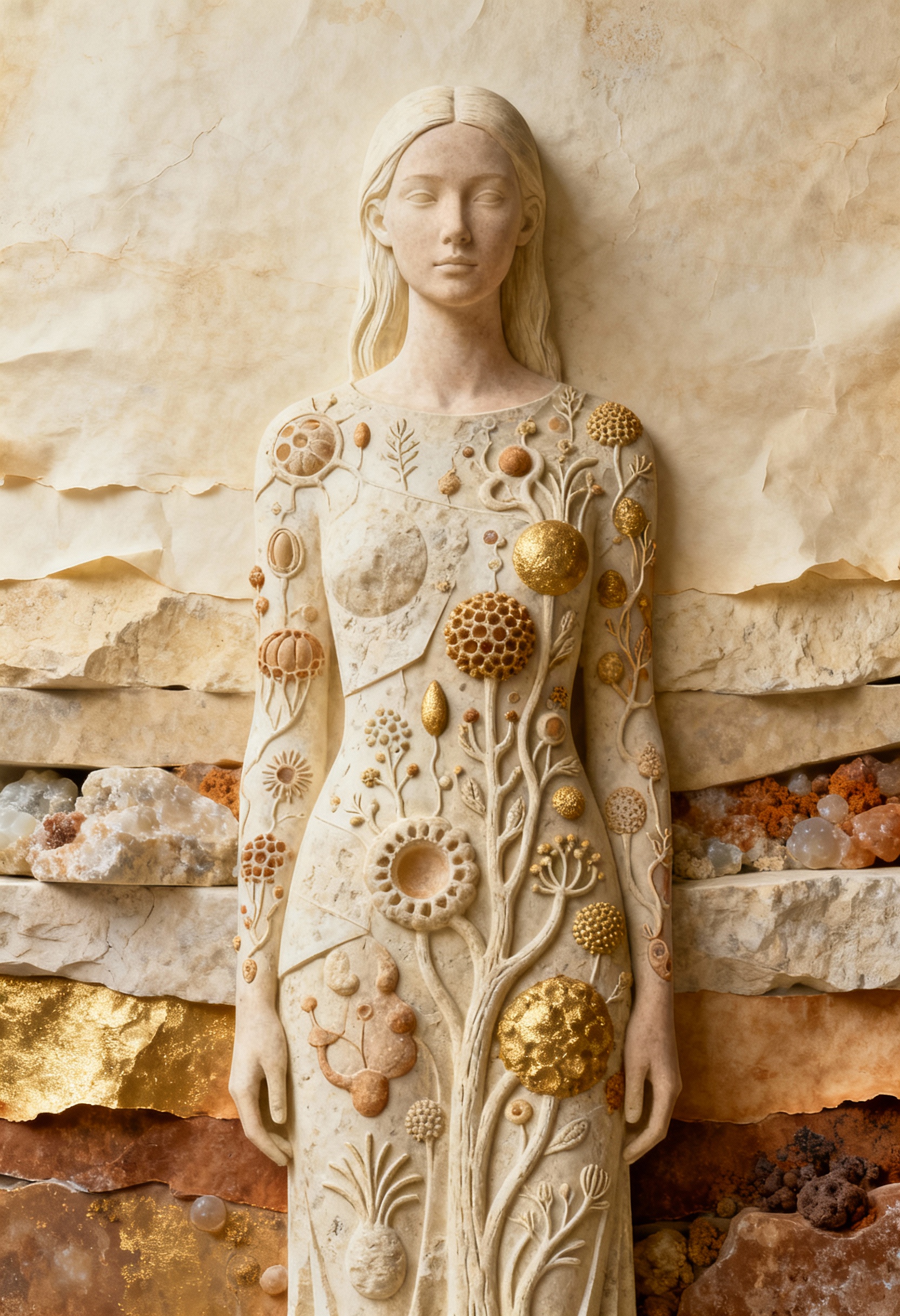 Sie zeigen Wesen, die aus Stein geboren scheinen, umgeben von planetaren Bahnen, heiligen Zeichen und stiller Energie.