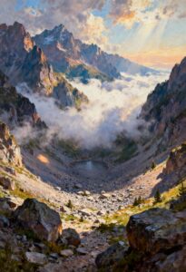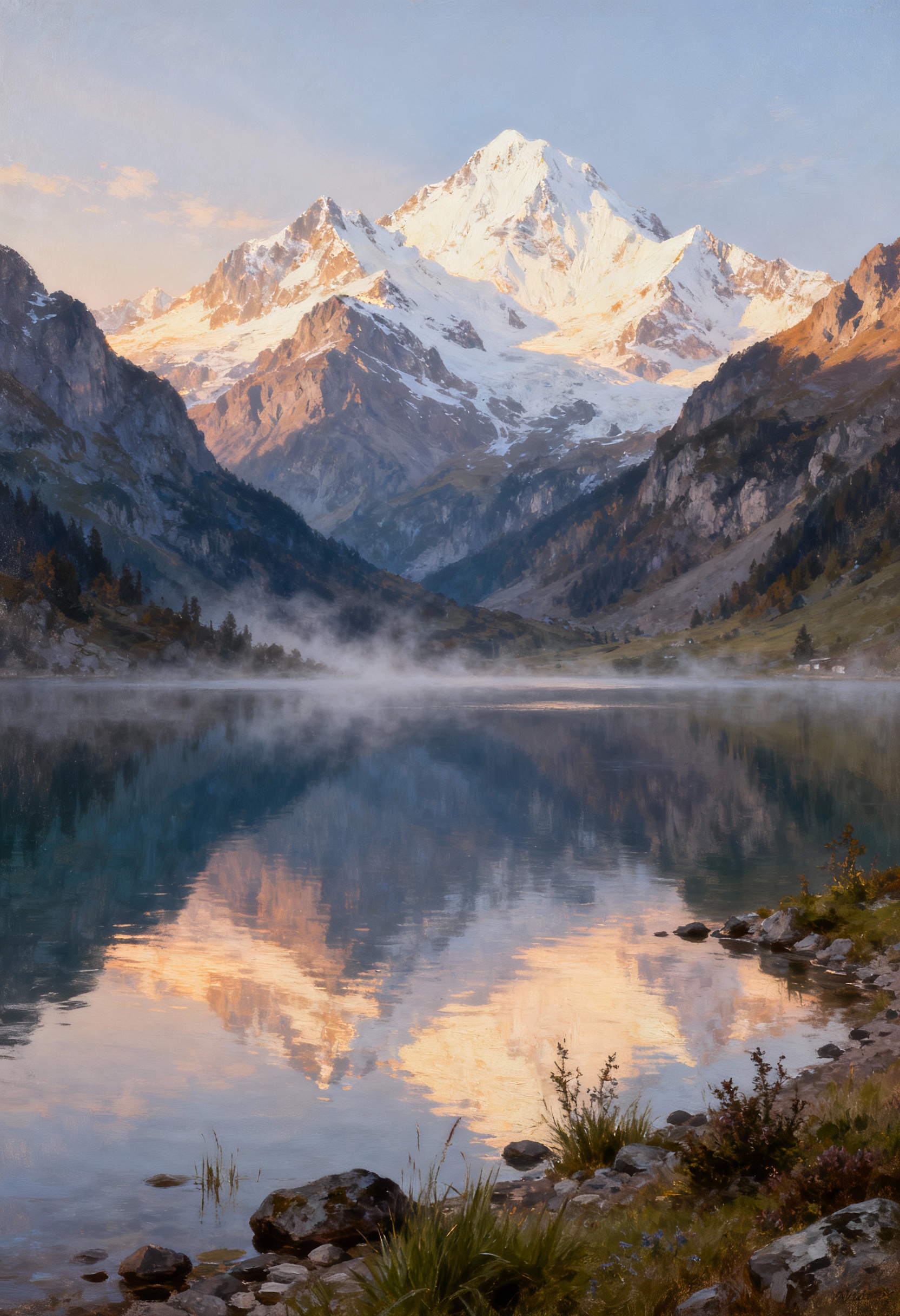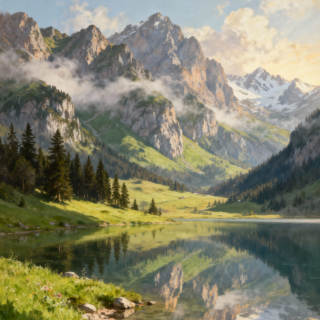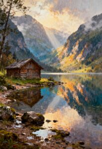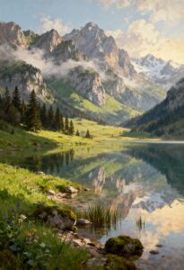 Wonderpiks präsentiert KI-generierte Kunstwerke, die alpine Landschaften, natürliche Ruhe und harmonische Lichtstimmungen mit klassischer Bildästhetik verbinden.